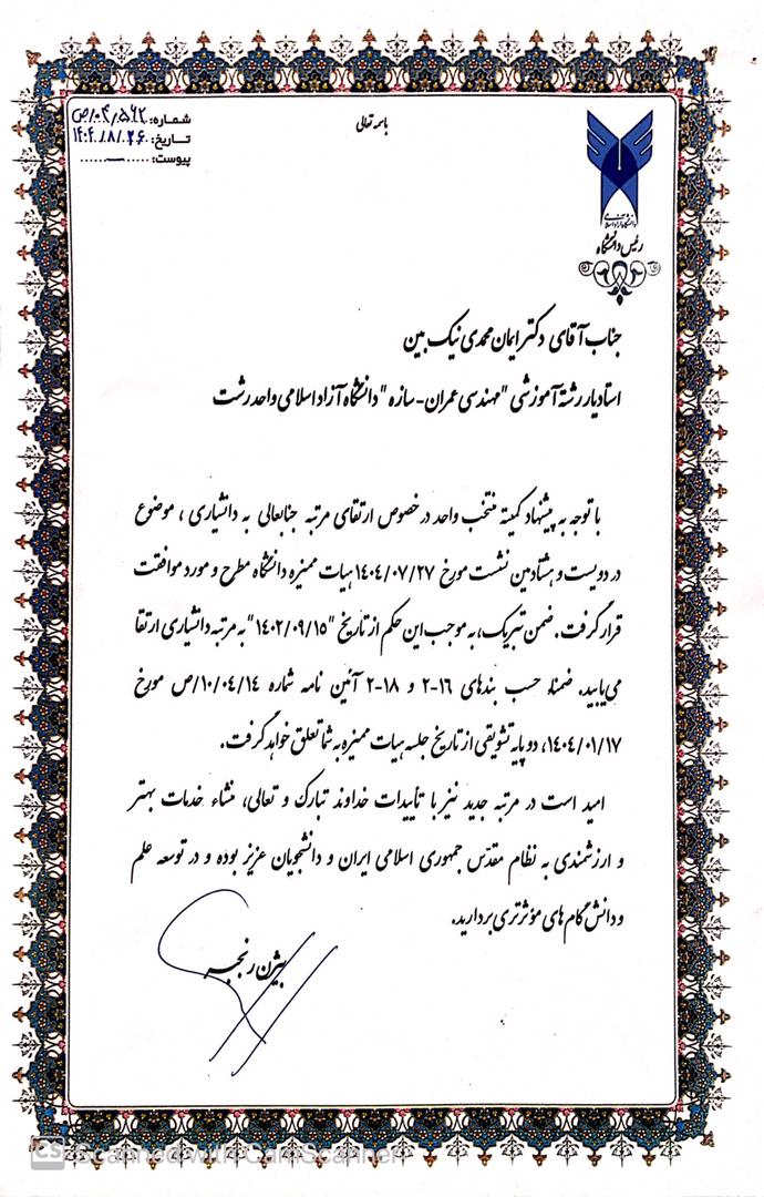 به گزارش لاهیج دیلم ، با رای هیات ممیزه و حکم دکتر بیژن رنجبر رئیس دانشگاه آزاد اسلامی کشور، دکتر ایمان محمّدپور نیک بین استادیار رشته آموزشی مهندسی عُمران-سازه دانشگاه آزاد اسلامی واحد رشت با توجه فعالیت های آموزشی و پژوهشی به مرتبه آموزشی دانشیار ارتقا یافت.